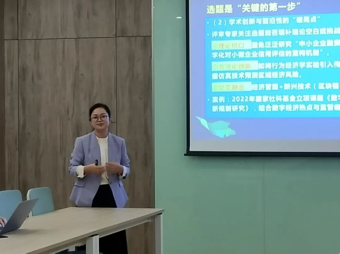 数字金融学院颜淑蓉教授以《科研项目申报的几点体会》为题带来深度分享,从认知重构、选题策略、论证技巧到心态修炼,为在场教师拆解科研申报核心逻辑:她提出申报是价值呈现而非求资助,需以申报书为产品说明书向“客户”(国家)展现研究价值;选题要紧扣“新质生产力”“数字经济”等政策热点与学术前沿,通过跨学科融合打造创新“破局点”,同时衔接团队前期成果构建差异化竞争力;论证环节需遵循黄金圈法则,先答“为什么做-打动人心”、再讲“怎么做-体现功力”、最后 “做什么-明确产出”,以逻辑严密、语言精炼的真功夫打动评审;她还建议将申报视为学术修炼,以打磨优化的耐心、坚守创新点的定力推进,强调中榜是“惊喜”而非“目标”,过程本身即是思考系统化的成长。整场分享既有理论高度又有实践细节,为骨干教师破解科研申报难题、提升申报成功率提供了实用指引。