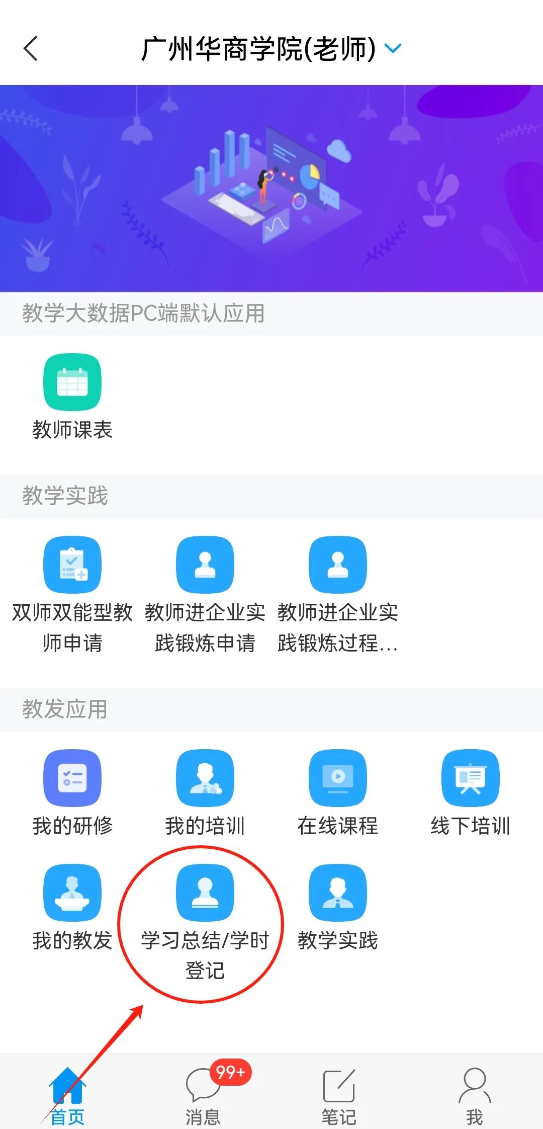在学时认定环节,教师个人参加各类学术会议、学习培训等活动后,可在平台上传学习总结或相关证书材料并提交学时申请。教师登录学习通账号后,后续操作指引如下: