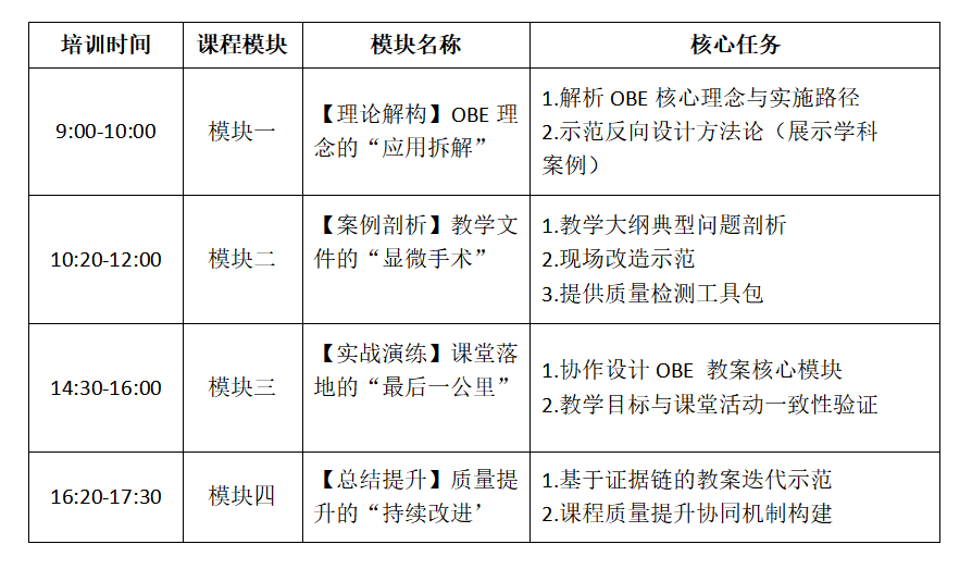 通过OBE(Outcomes-Based Education)理论解读、案例剖析、实战演练等模块的学习,提升教师将OBE理念贯穿于教学目标、课程体系及评价等方面的设计能力;能读懂人才培养方案、课程大纲,根据OBE理念撰写课程教案和授课课件,确保教育过程与人才培养目标高度匹配。